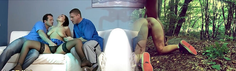 Busty Latina loves to experiment with two bi dudes