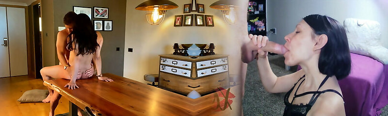 Real couple energetically fucking my pregnant wife on a table. Passion, romance, love and intense