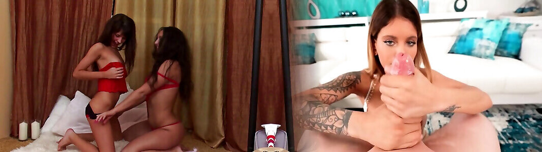 Mischievous teenies with petite knockers bang each other with a rope-on