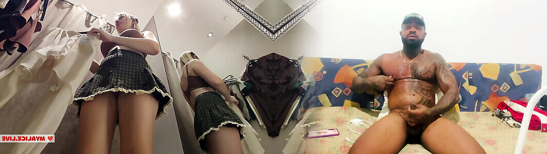 Horny Big-Titted Blonde Slut Flashes Her Wet Pussy, Miniskirt No Undies in Curtain Fitting Room, Public Caught Risk Thrill