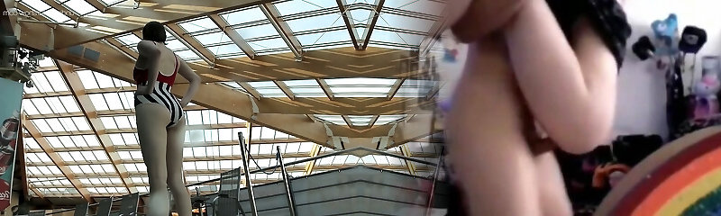 Super-cute and fresh pale flesh teen babe in bathing suit dives in the pool
