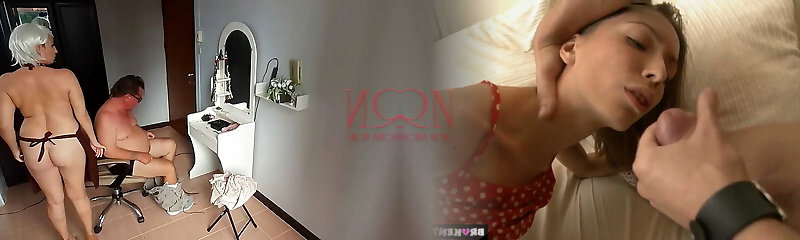 Naturist barbershop. Nude lady hairdresser in an apron makes client to strip. The client is astonished. S1